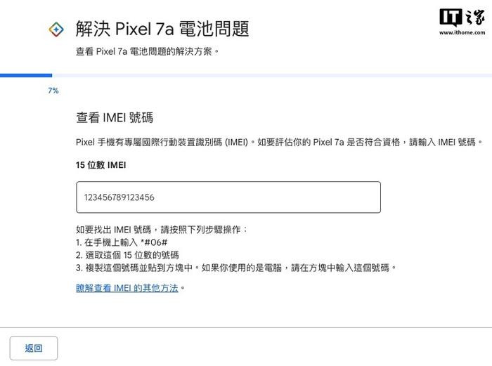 同时,谷歌还提供了一个网页,在该网页输入Pixel7a手机的IMEI码后即可初步确认用户手中的Pixel7a是否可以免费更换电池或现金补偿。